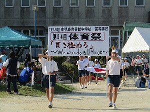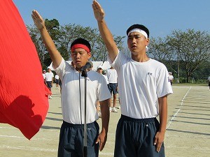 選手宣誓。中学3年池田君(左:川上小学校出身)高校3年前村君(左:伊集院中学校出身)
