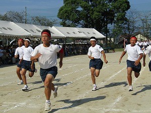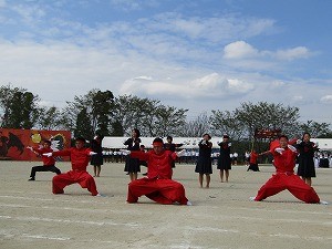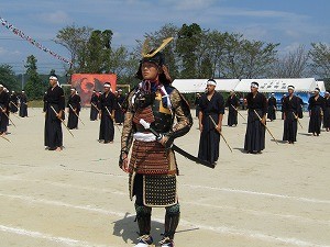 本校伝統の剣道体操。甲冑を来て体操する生徒もいます。