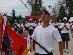 今年の優勝は白組でした。優勝旗を受け取る高校3年日髙君(中央中学校出身)