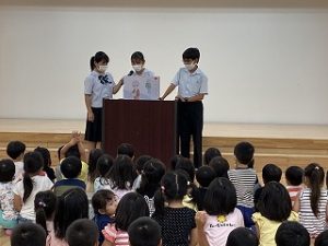 2年1組は総合の時間の取り組みとして、オリジナル紙芝居の製作を行いました。そこで伊集院町内の各施設で読み聞かせを実施しました。 8月27日は朝日ヶ丘幼稚園と伊集院幼稚園。9月3日は妙円寺小学校6年生を対象に行いました。
