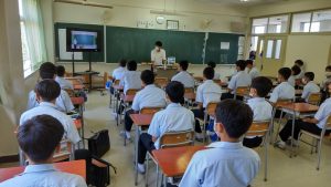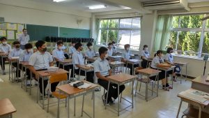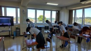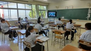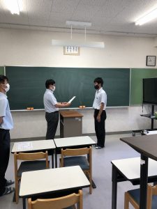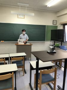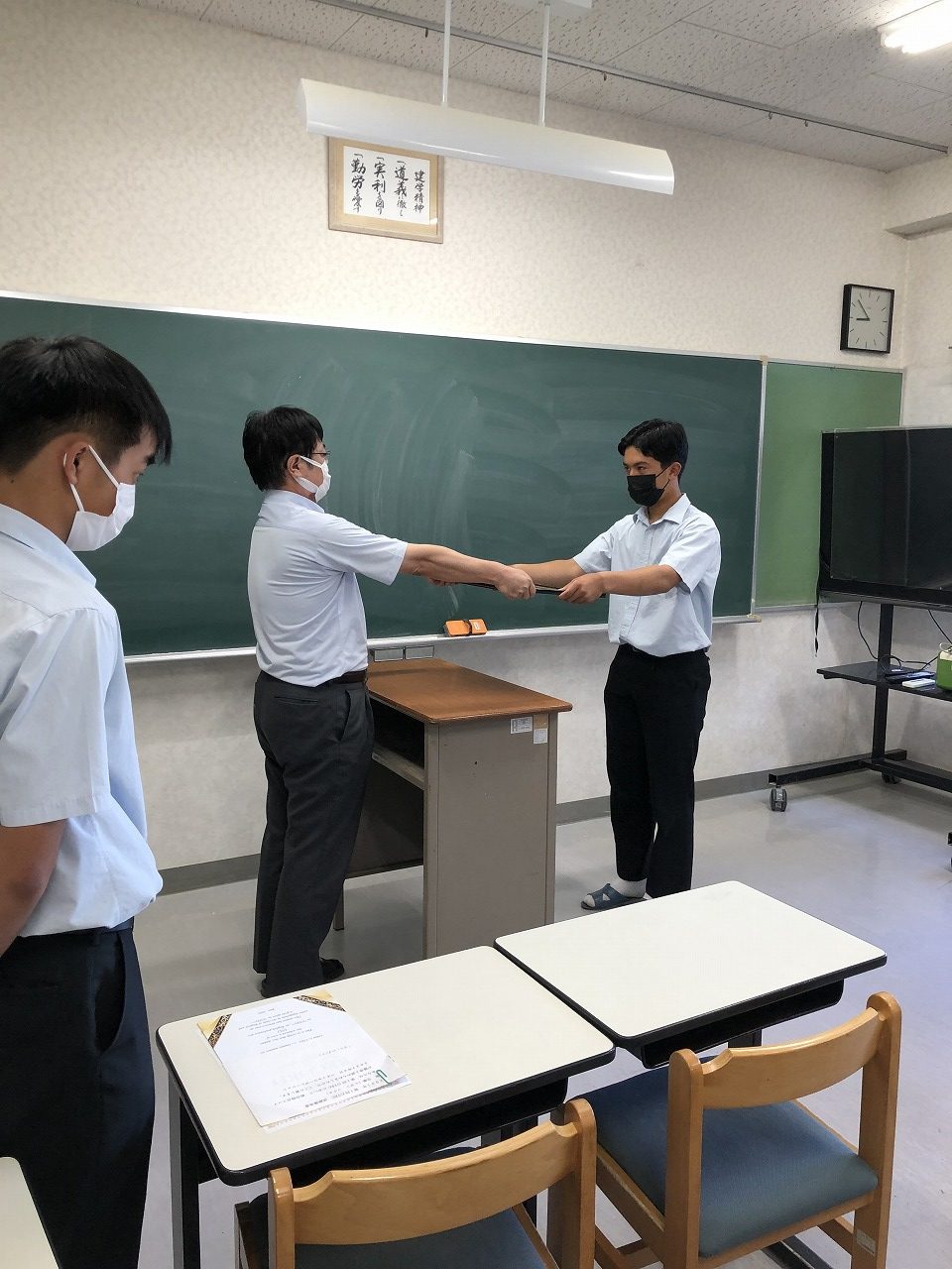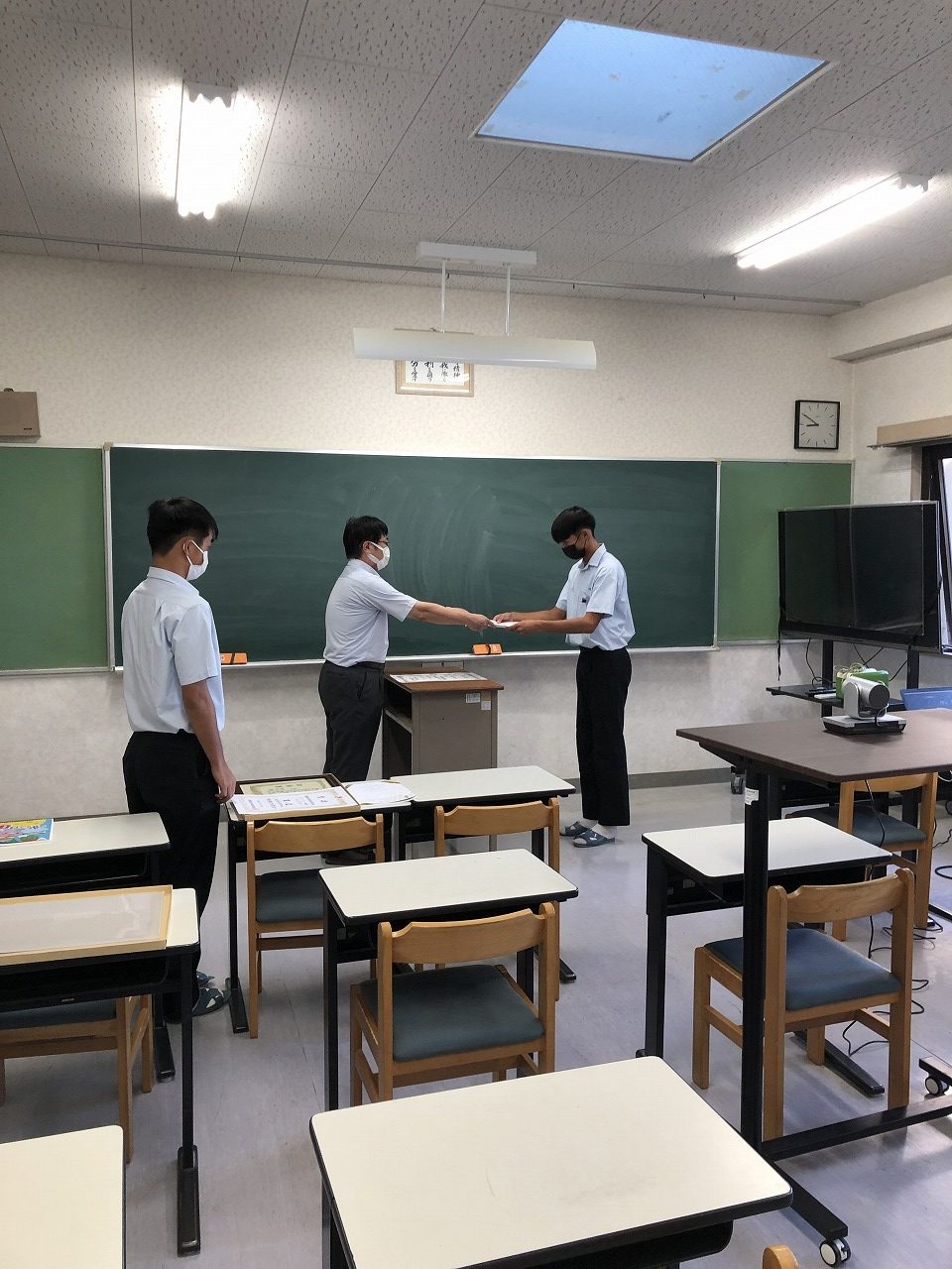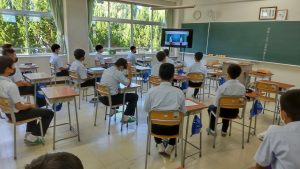 コロナ感染拡大防止のため、各教室でモニターを通じて始業式が行われました。 (後期補習の再開時に、緊急事態宣言下での学校行動基準について説明済み) 始業式の前に、表彰式も行われました。 GTEC 代表…高3東くん 漢字能力検定 代表…高1大城さん 中学バドミントン部 県大会準優勝 中学サッカー部 九州大会準優勝 中学野球部 全国大会第3位